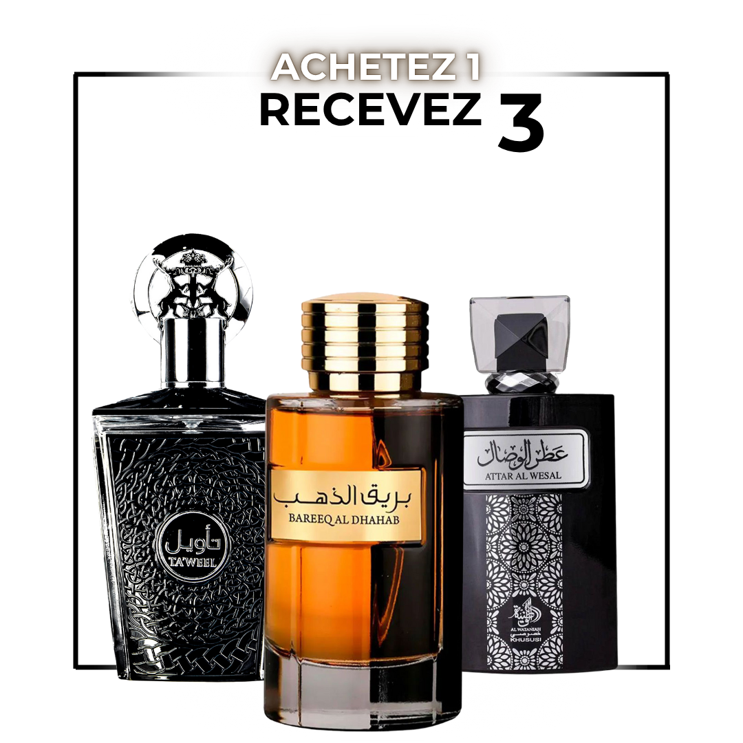 Pack Trio Parfums Arabes pour Homme – Taweel Noir | Bareeq Gold | Wesal Essence